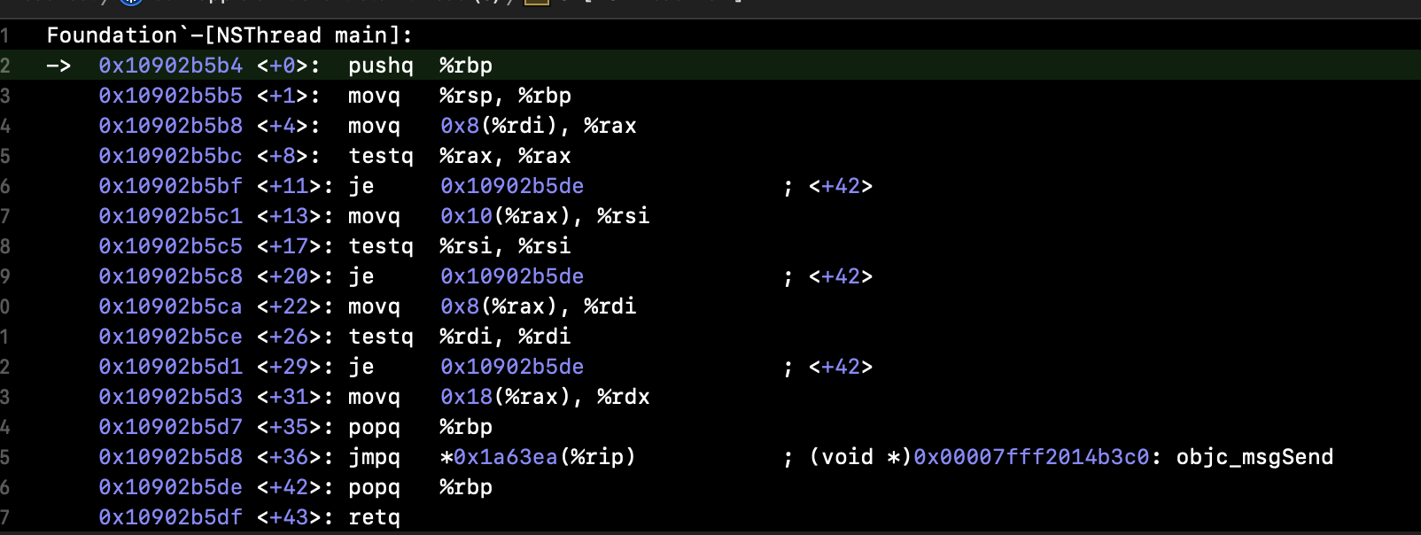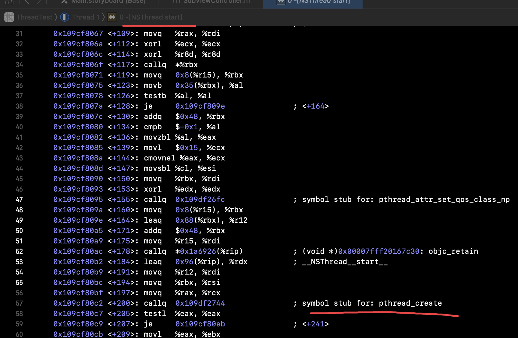 下两个符号断点:-[NSThread start]和-[NSThread main],通过汇编分析: