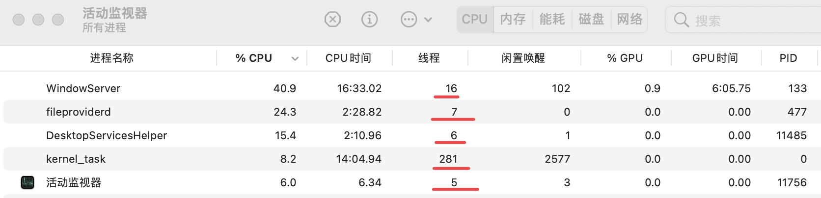 例如MAC中的活动监视器,可以看到每一个进程都有n条线程