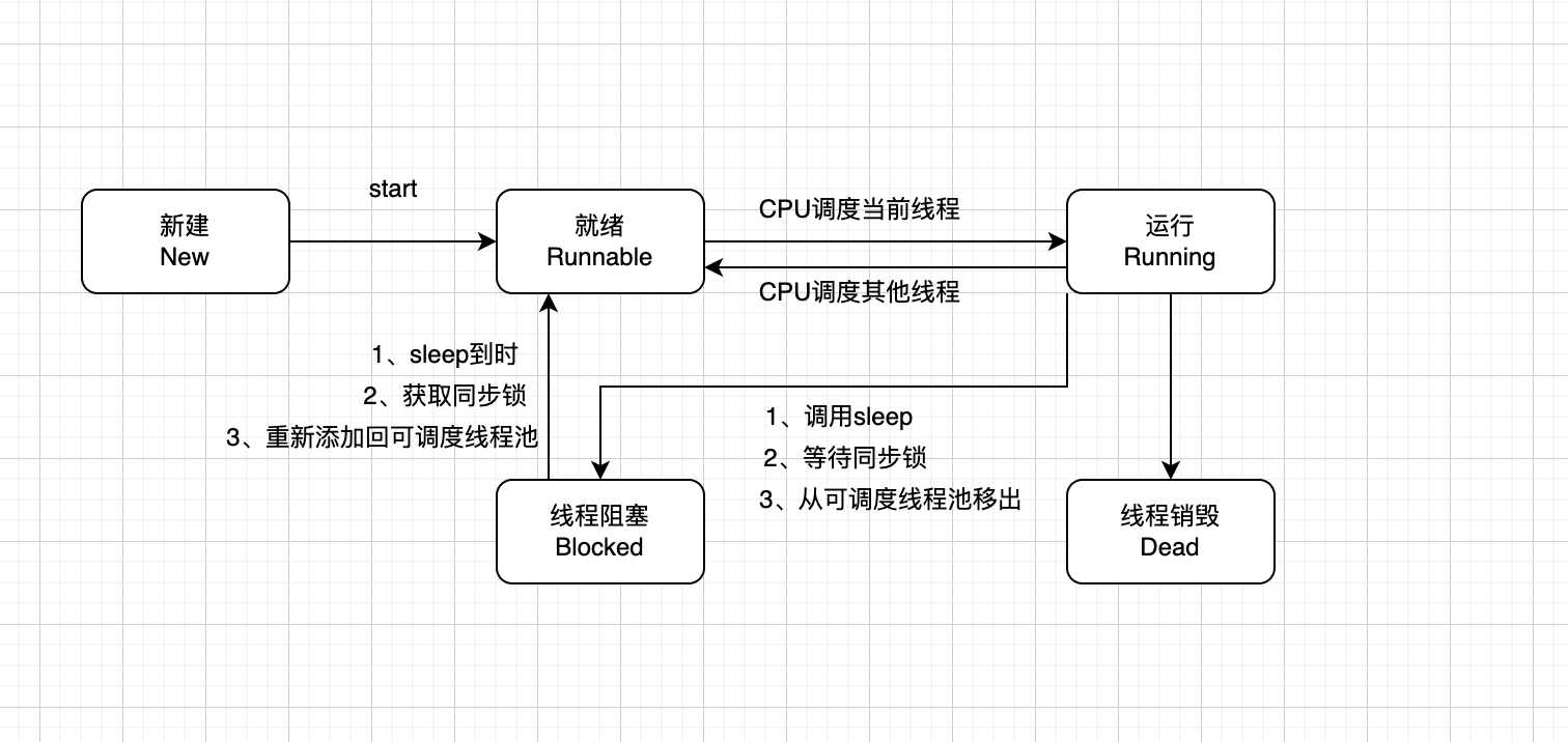 注意:当线程因为sleep、等待同步锁或者被移出可调度线程池而阻塞后,在sleep到时,获取同步锁或者重新添加到可调度线程池之后,并不会立马运行,而是会再次进入就绪的状态,等待cpu调度。