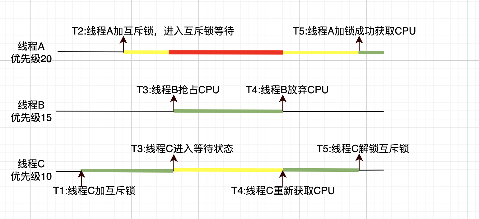 在上面这个时序里,因为程序逻辑,线程A确实应该等到线程C完成之后,才能获取CPU,这里没有问题。但是线程B从T3到T4占据CPU运行的行为,就是优先级反转。
