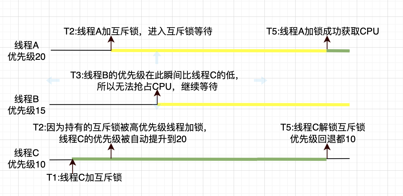 系统会通过“优先级继承”来解决优先级反转问题,当在T2时间点时,系统会拿到持有锁的线程,把低优先级的线程优先级提高到高优先级线程的优先级。当T3时间点时,就不会被线程B所抢占了。