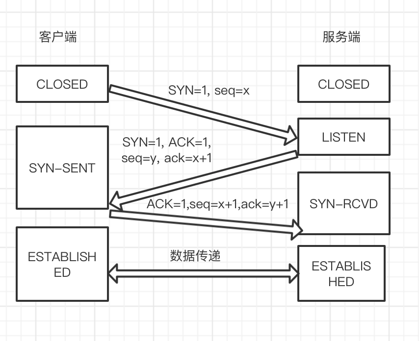 第一次握手:客户端发送连接请求到服务端,带的报文头部中的信息是: SYN=1以及随机生成初始化序列号seq=x。此时客户端进入SYN-SENT状态,等待服务端的确认。(报文:SYN=1 、seq=x)