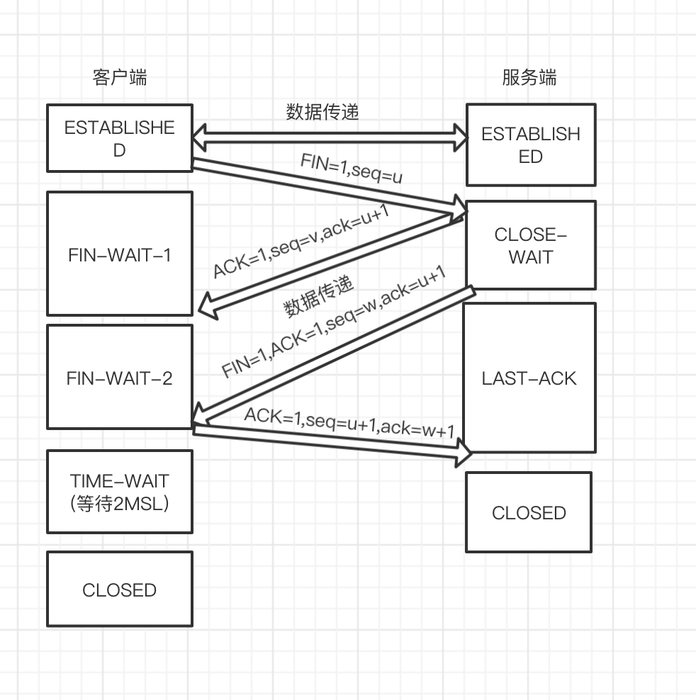 第四次挥手:客户端收到回复之后,向服务端发送ACK=1、ack=w+1、seq=u+1,此时客户端进入TIME-WAIT状态。必须经过2MSL(最长报文段寿命)的时间后,客户端没有收到服务端发来的任何数据,证明服务端已正常关闭,进入CLOSED状态。服务端收到客户端的确认后,立刻进入CLOSED状态。(服务端结束TCP连接的时间要比客户端稍微早一些) (报文:ACK=1、ack=w+1、seq=u+1)
