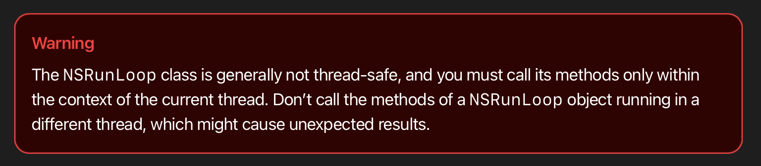 而NSRunLoop官方文档明确写道,它是非线程安全的: