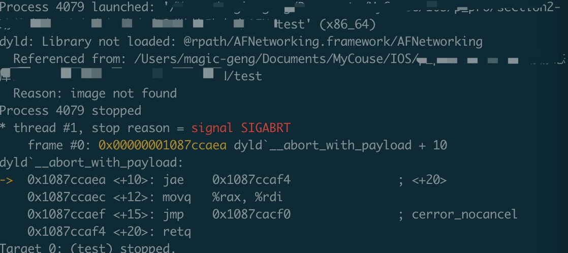此时,以及编译生成动态库的framework,并且链接成功,我们再通过lldb运行一下,依然报错:dyld: Libraray not Loaded @rpath 和 image not found。