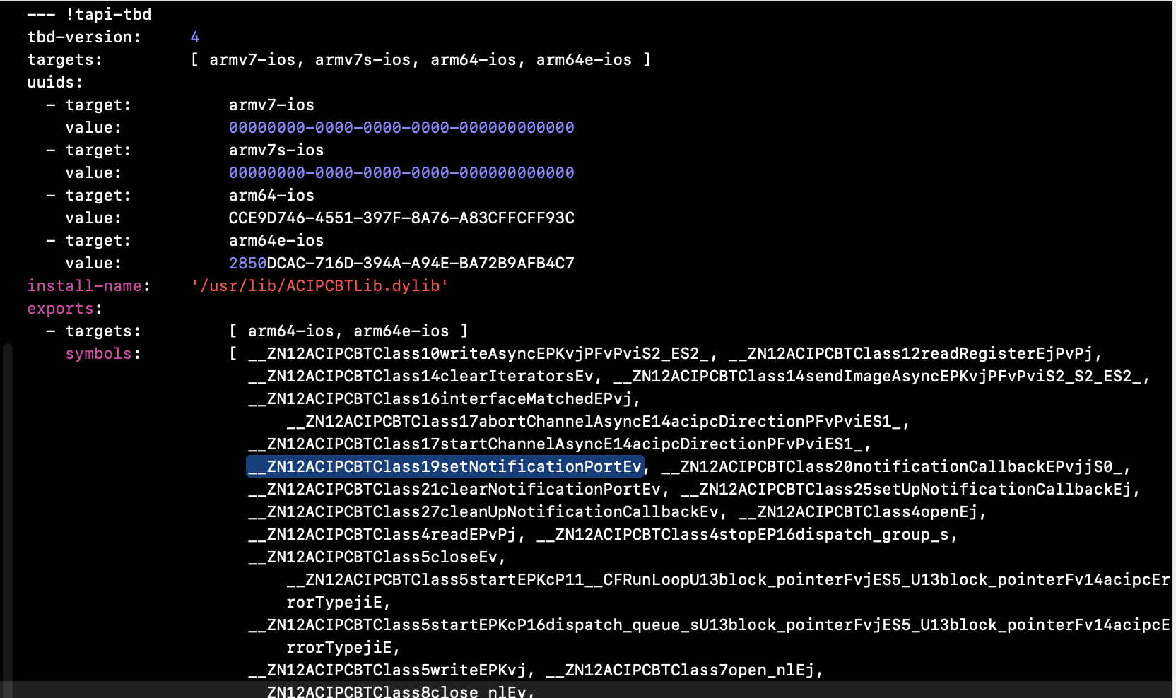 可以看到, ACIPCBTLib.tbd中记录了动态库的信息和导出符号。等到真正运行在真机上的时候,会通过tdb记录的信息去指向真机中实际上存在的动态库,然后加载。