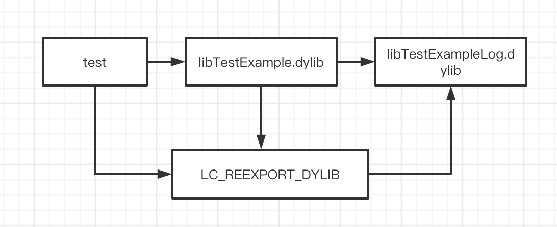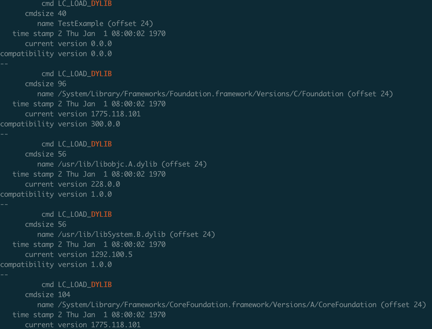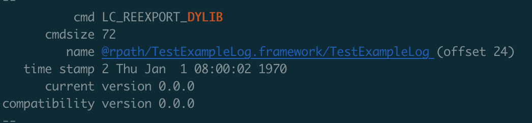 我们可以看到,在TestExample中,多出了一个LC_REEXPORT_DYLIB。这就意味着test在链接TestExample的时候可以通过TestExample中保存的LC_REEXPORT_DYLIB这个Load Command去找到TestExampleLog动态库。
