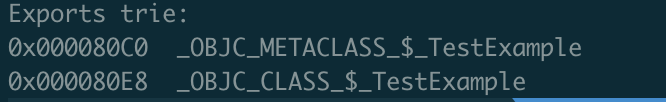 如果要让test直接能调用TestExampleLog,那么TestExampleLog必须将导出符号保存在TestExample的可执行文件中,我们通过objdump --macho --exports-trie TestExample 查看一下导出符号: