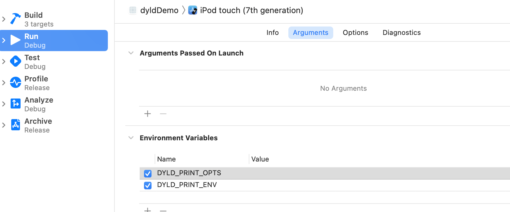 我们在Xcode中设置一下 DYLD_PRINT_OPTS 和 DYLD_PRINT_ENV :