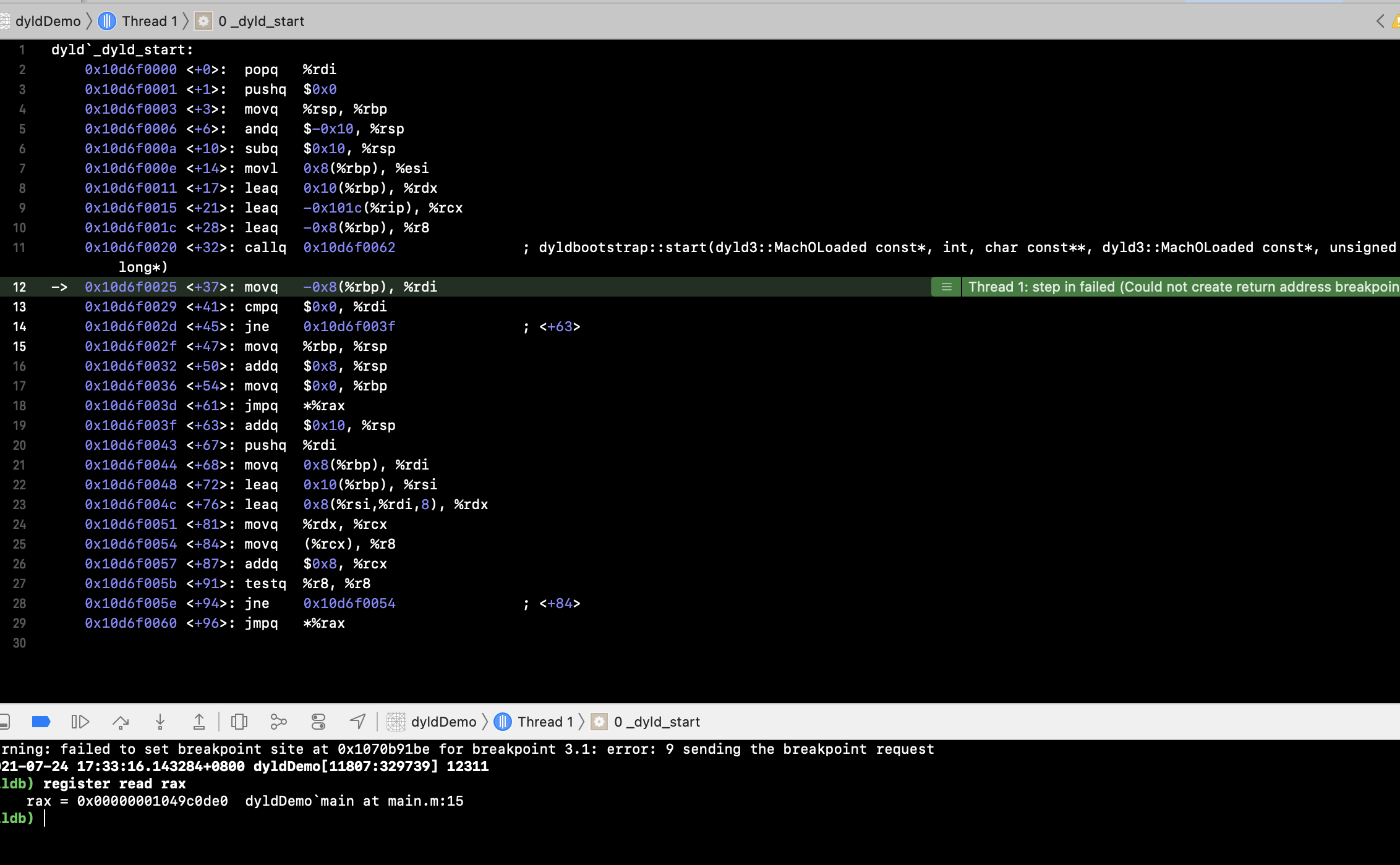 在dyld的main函数执行完之后,也就是所有的初始化和加载、链接等完成之后,会返回一个main()的函数地址。我们可以通过断点调试来证明: