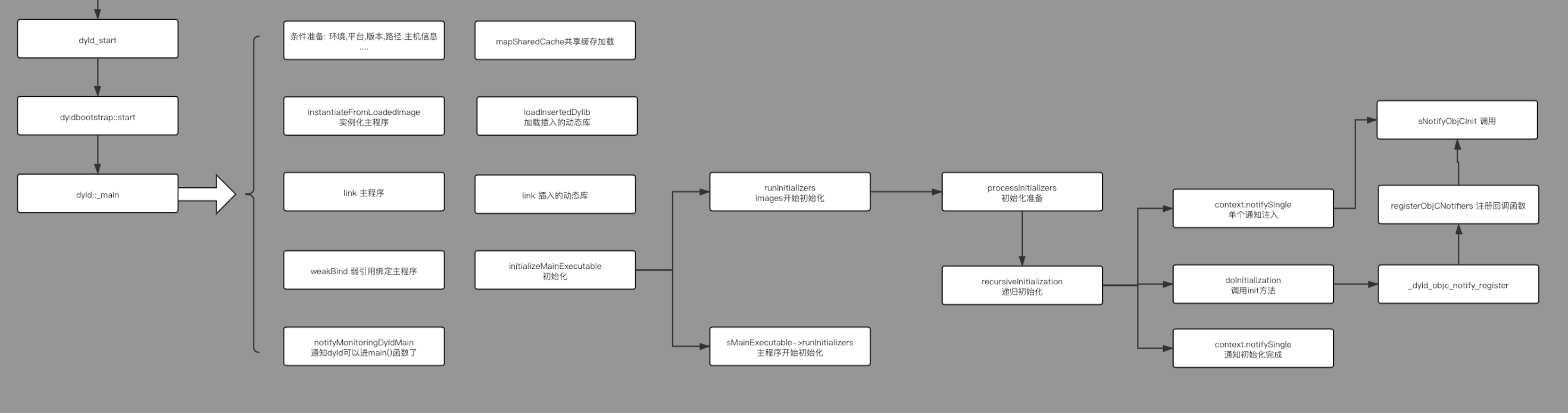 通过前面对dyld的分析,我们已经分析到了最核心的地方:递归初始化镜像文件。这篇文章就具体来分析初始化流程,比如初始化libSystem、libDispath、libObjc等系统库初始化的流程。