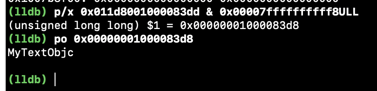 因为类在底层也是继承与objc_object的,类也是对象,所以此时 0x0000000100008400 这个其实是MyTextObjc的isa。这里我没有用 0x0000000100008400 & 0x00007ffffffffff8ULL。因为结果都是0x0000000100008400。