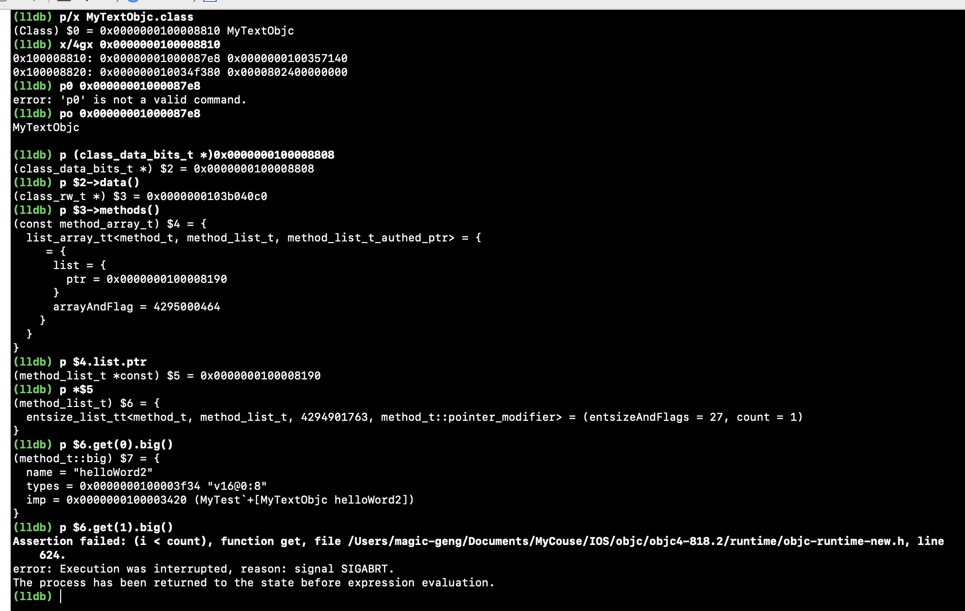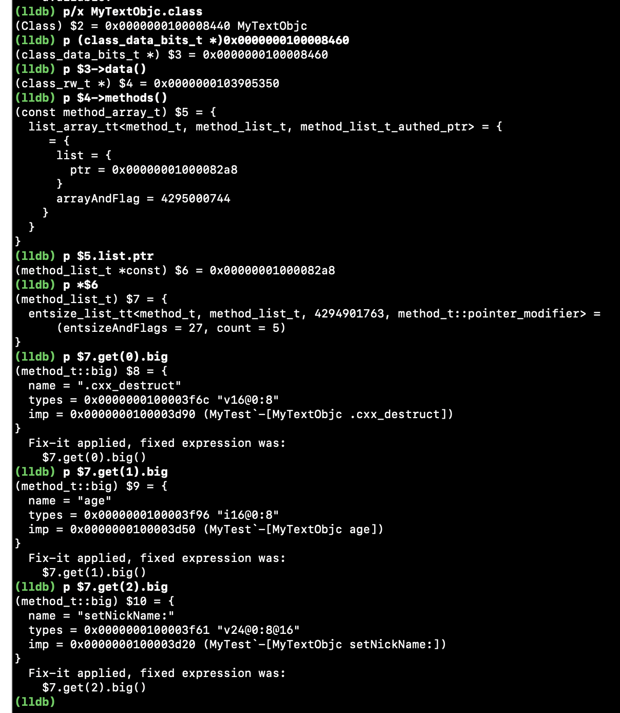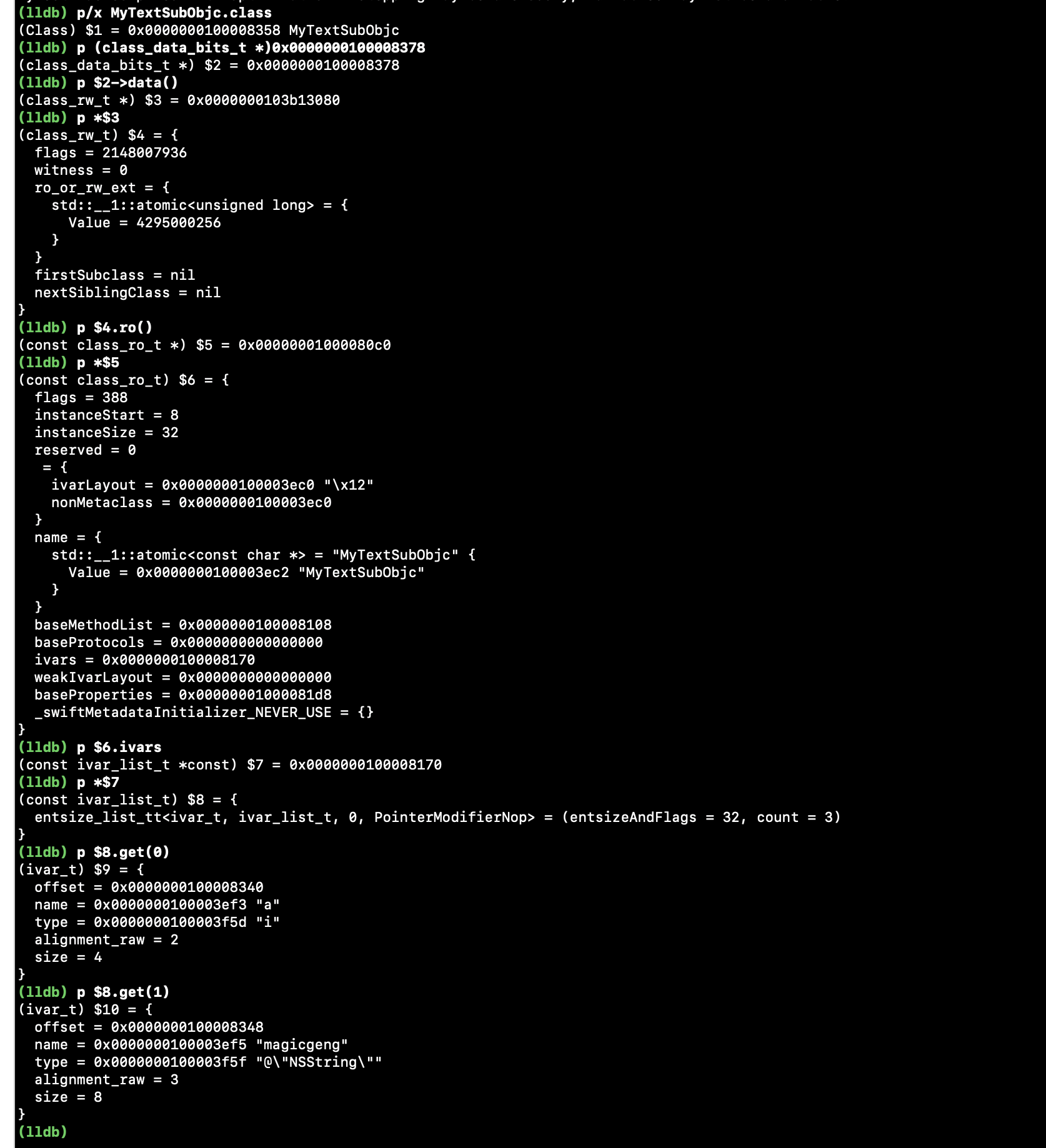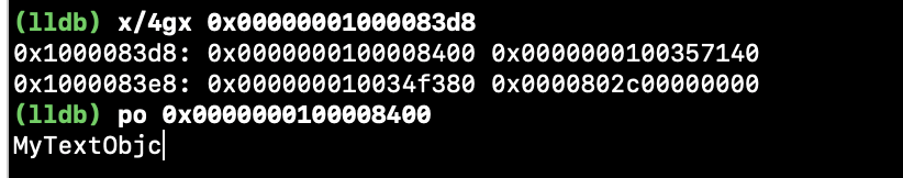 通过上面的打印,我们发现:0x00000001000083d8 和 0x0000000100008400 都是MyTextObjc。其中0x00000001000083d8 是类,0x0000000100008400是元类。