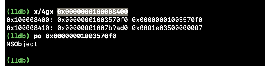 我们发现打印出来的内存地址为 0x100008400,对应的isa类信息为NSObject。